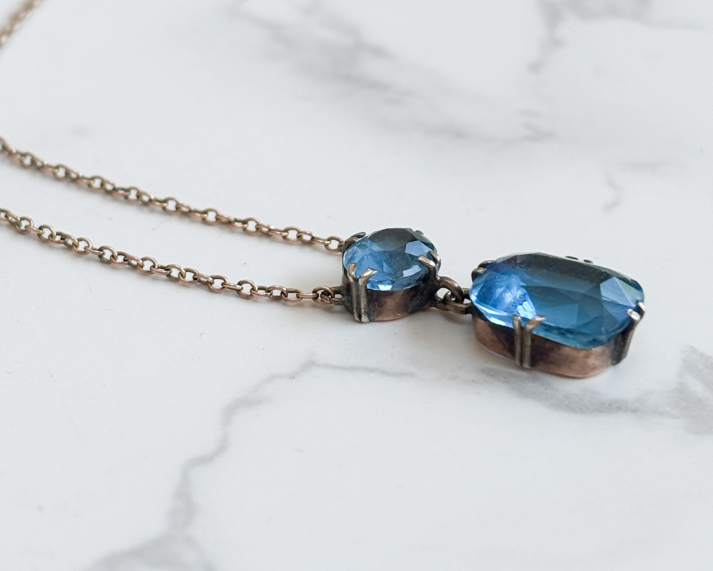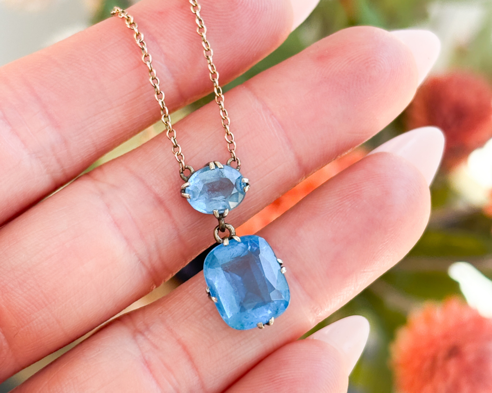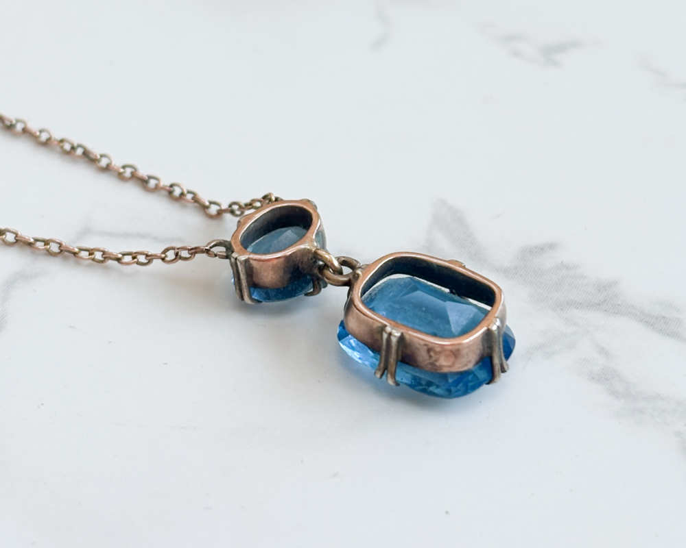 This is an eye catching 9ct gold and blue paste necklace circa 1920s. It features two vibrant blue paste stones set in warm 9ct gold with a total length of 18 inches. The top stone, a soft oval cut, glows with cool oceanic clarity, while the larger cushion cut drop below adds weight, glamour and a burst of vibrant azure to the neckline.