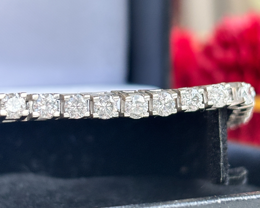Classic, sophisticated and effortlessly wearable, this diamond tennis bracelet is a true statement of luxury. Crafted in 14ct white gold, it features 5.5ct of dazzling round cut diamonds that radiate brilliance and sparkle. Each diamond has been carefully selected with an H/I colour grading for a bright, white appearance and SI2 clarity, ensuring a stunning shimmer. The diamond tennis bracelet has a secure box clasp and safety latch, offering both style and security. Designed for both everyday glamour and special occasions, this is a timeless investment piece that never goes out of style.