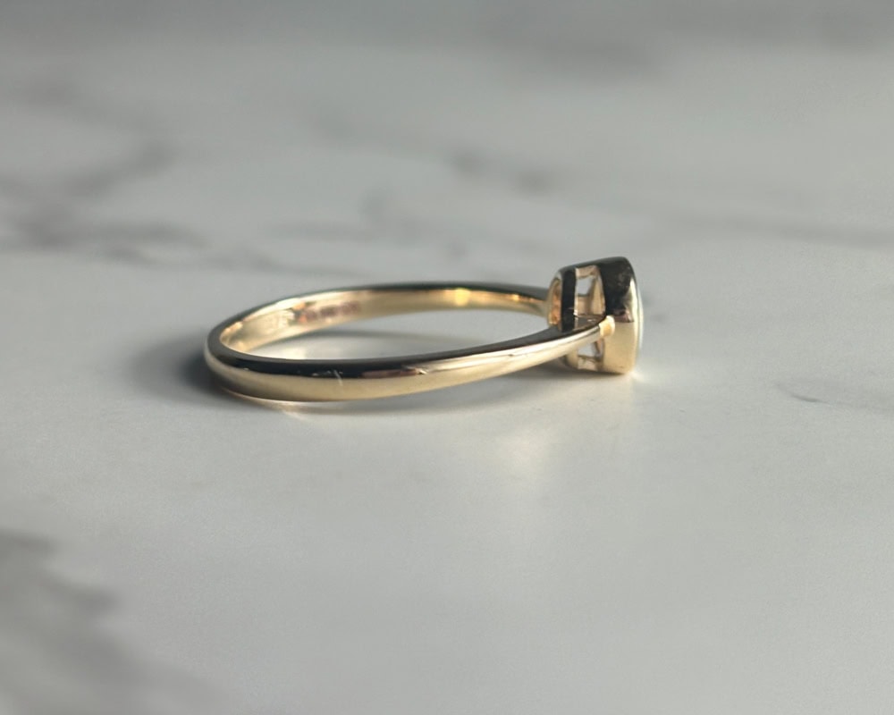 This is a modern opal ring set in 9ct yellow gold with a minimalist and elegant design. A round opal sits securely in a bezel setting, accentuating the soft, iridescent play of colour. With a milky base, the beautiful opal has green, blue and pink hues, which are emphasised by the simple yellow gold setting. This opal ring is perfect for those who appreciate clean lines and can be worn as a stacking ring, or on its own for an understated yet sophisticated look.