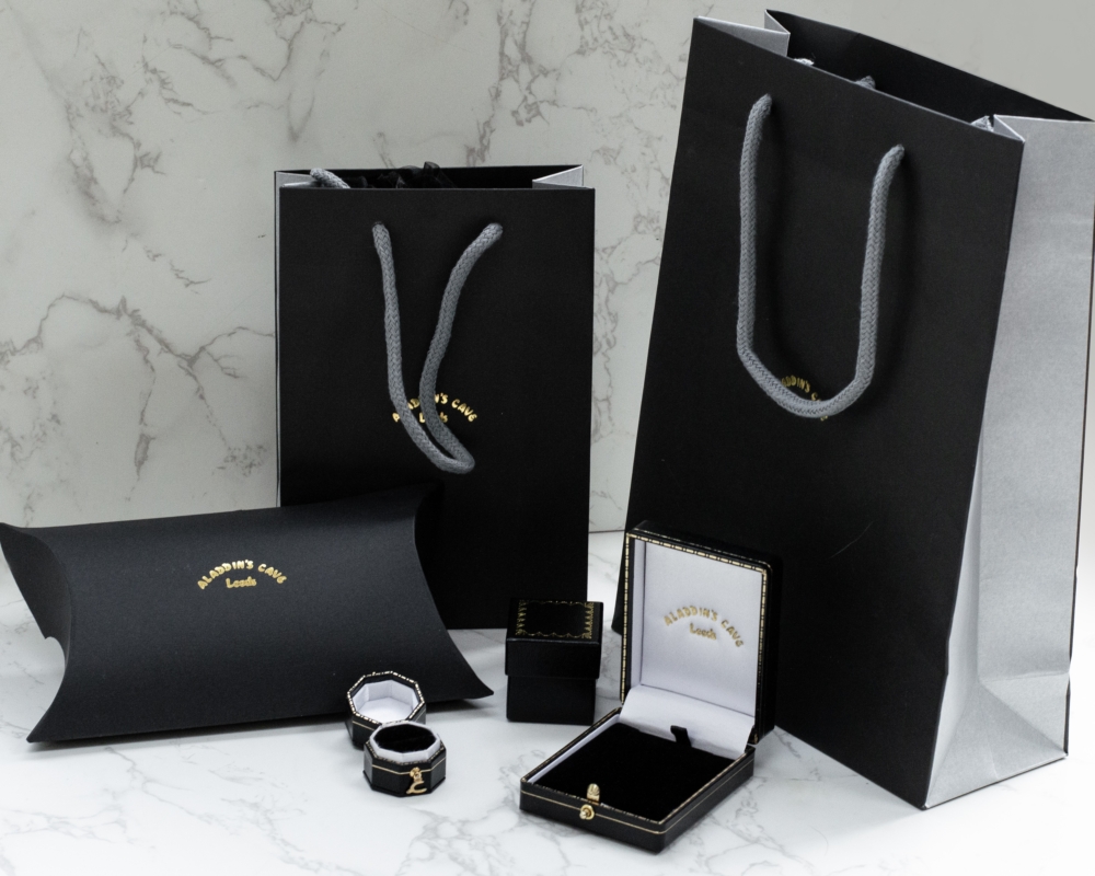 Our jewellery comes packaged in a beautiful black faux leather box and black branded gift bag.
