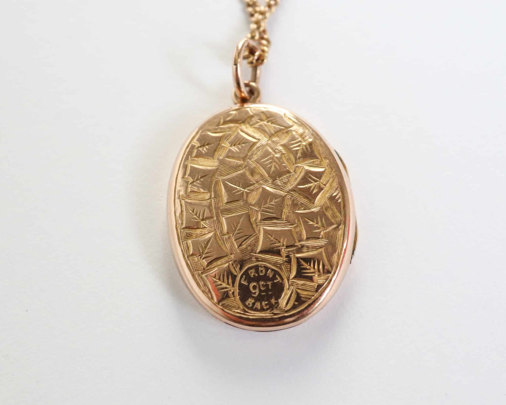 A sweet antique gold locket from the Victorian era. This oval locket is 9ct gold back and front, which was a popular technique during this era, whereby the front and back are solid gold, but the inner findings and material are base metal. This tech it was used to make the inside more hard wearing. This antique locket has wonderful heart detail on the front and unusual engraving on the back. It is an intricate Victorian piece and comes complete on an 18 inch long curb link gold chain. Wear everyday on its own or layered with other gold chains and pendants.