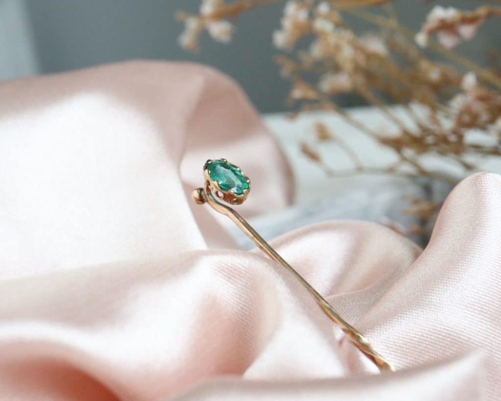 An attractive antique gold stick pin crafted circa 1910. This 9ct gold pin has an oval claw set green stone at its peak. The pin has zig zag indentations which often feature on stick pins to keep them in place. It is a simple yet striking piece of antique jewellery suitable for wearing on a scarf, lapel, tie or cravat.