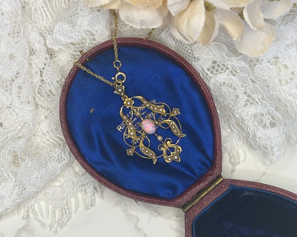 A beautiful antique Art Nouveau opal and seed pearl pendant set in 9ct yellow gold. This stunning piece has the curved feminine lines and intricate detailing typically associated with the Art Nouveau era. At the heart of the pendant is an oval cut opal which displays a wonderful play of colour, from pink to blue depending on the light. The opal is complemented by the elegantly placed seed pearls, which give the pendant both a classic and delicate aesthetic. Please note the chain is not included, this can be bought separately – contact us for more info.