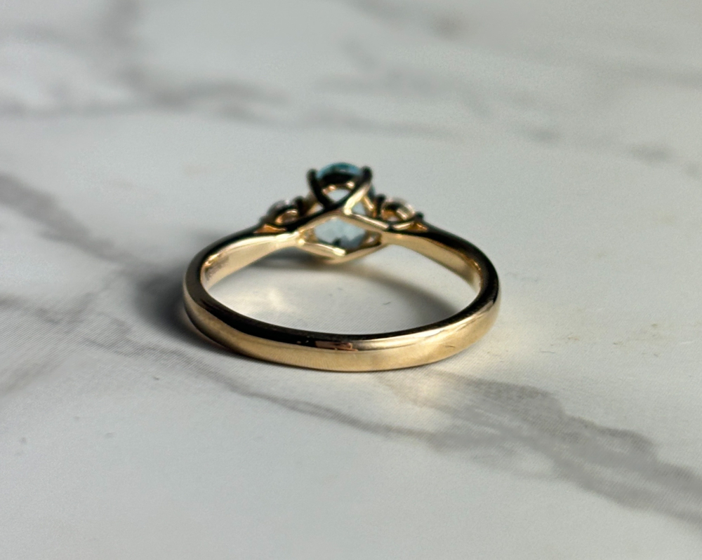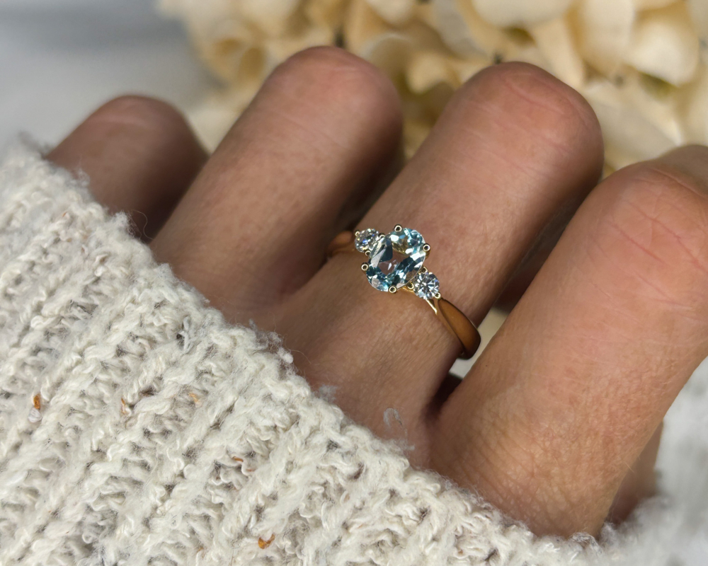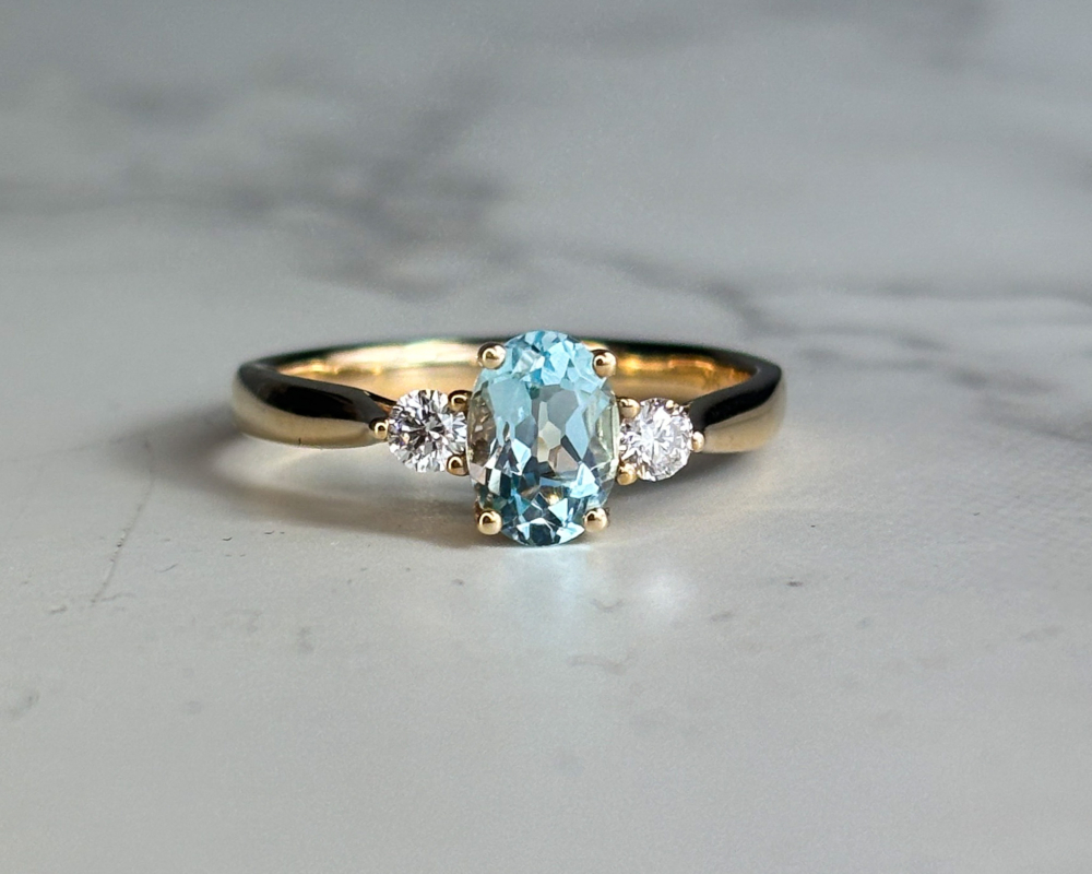 A very pretty antique style blue topaz and diamond ring in a classic trilogy setting. The focal point of this contemporary ring is the piercing blue topaz oval cut stone at the centre, housed in a simple four claw setting. On either side of the blue topaz are smaller, round diamonds which complement the cool blue hue with their sparkle. The slightly tapered 9ct yellow gold shank is in keeping with the simplicity of the setting and provides a comfortable fit on the finger. Wear this stunning ring as a dress ring or engagement ring with a perfect pop of colour.