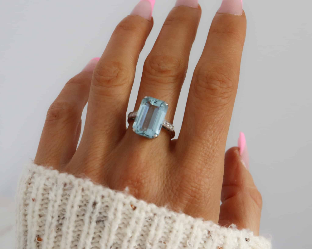 A breathtakingly beautiful original art deco aquamarine and diamond ring set in 18ct white gold and platinum. The emerald cut aquamarine is flanked by 3 small diamonds on each shoulder. This art deco ring has approx 7cts of aquamarine and is set in 4 claws. It is in fantastic condition and superb quality. This is a rare and stunning aquamarine and diamond ring and a fantastic investment piece. The stone is hardwearing enough to wear everyday as either a dress ring or an alternative engagement ring.