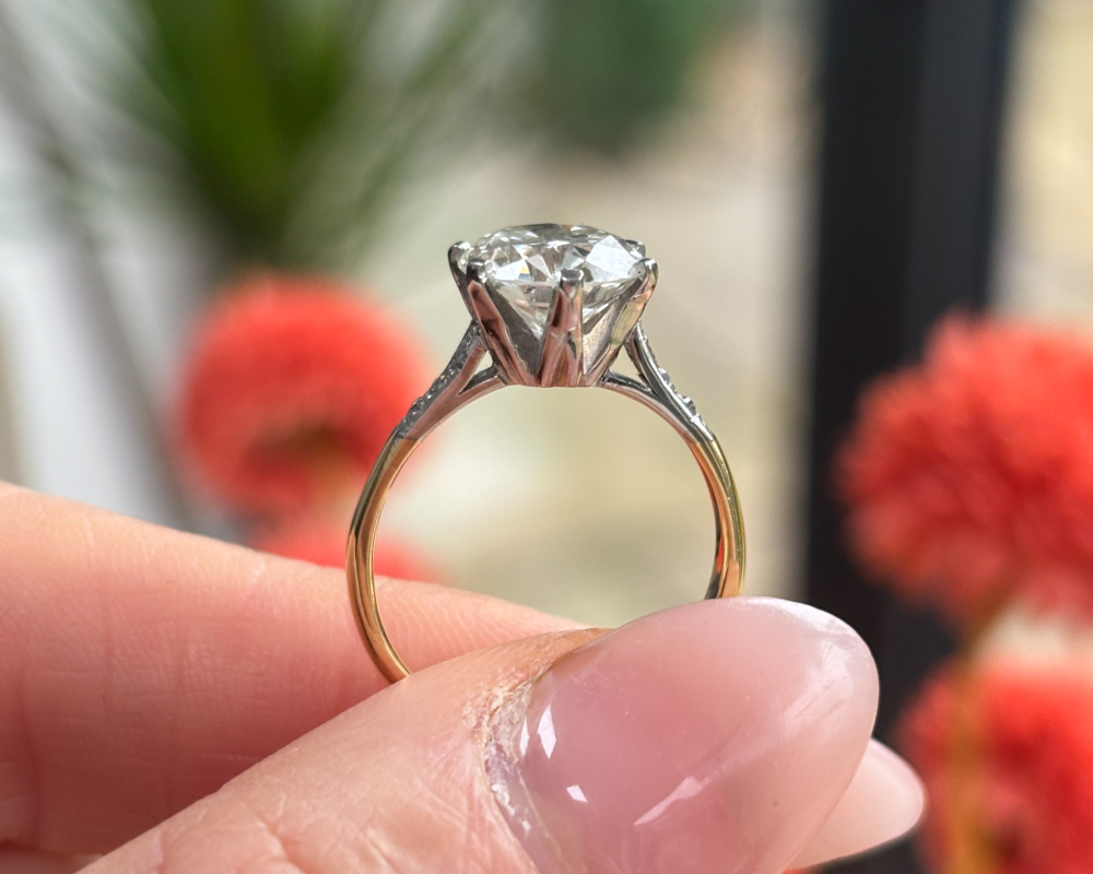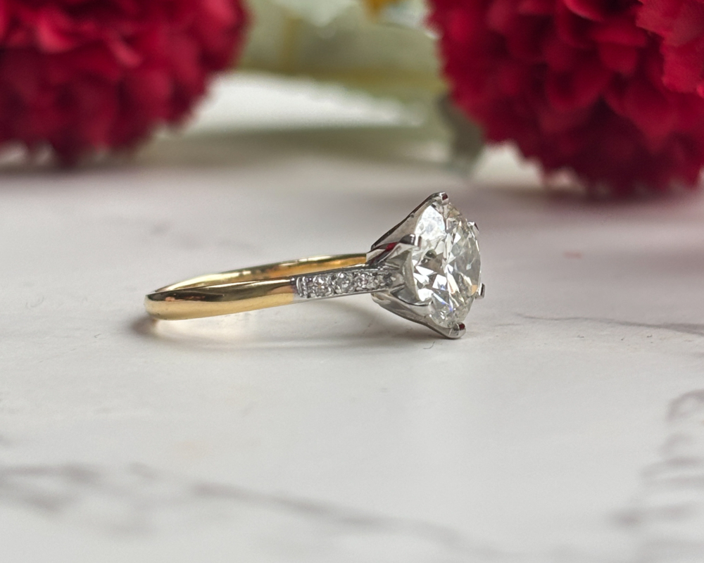 This stunning Art Deco diamond solitaire ring is a true masterpiece, designed with the elegance and craftsmanship of the 1920s. At the heart of this antique diamond ring is a dazzling 2.52ct transitional cut, claw set diamond, boasting SI2 clarity and I colour. Transitional cut diamonds are highly coveted for their deep facets and romantic sparkle, offering a timeless appeal that modern cuts often lack. The centre stone is complemented by delicate diamond shoulders that enhance its radiance and add to the intricate detailing that defines Art Deco jewellery. If you’re searching for a one of a kind Art Deco diamond engagement ring, this piece is an exceptional find. Whether as an engagement ring, anniversary gift or investment piece, it is a timeless statement of elegance and history.
