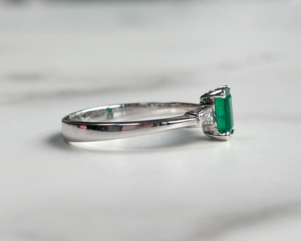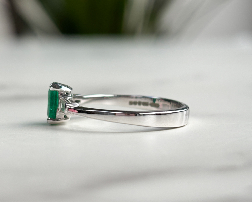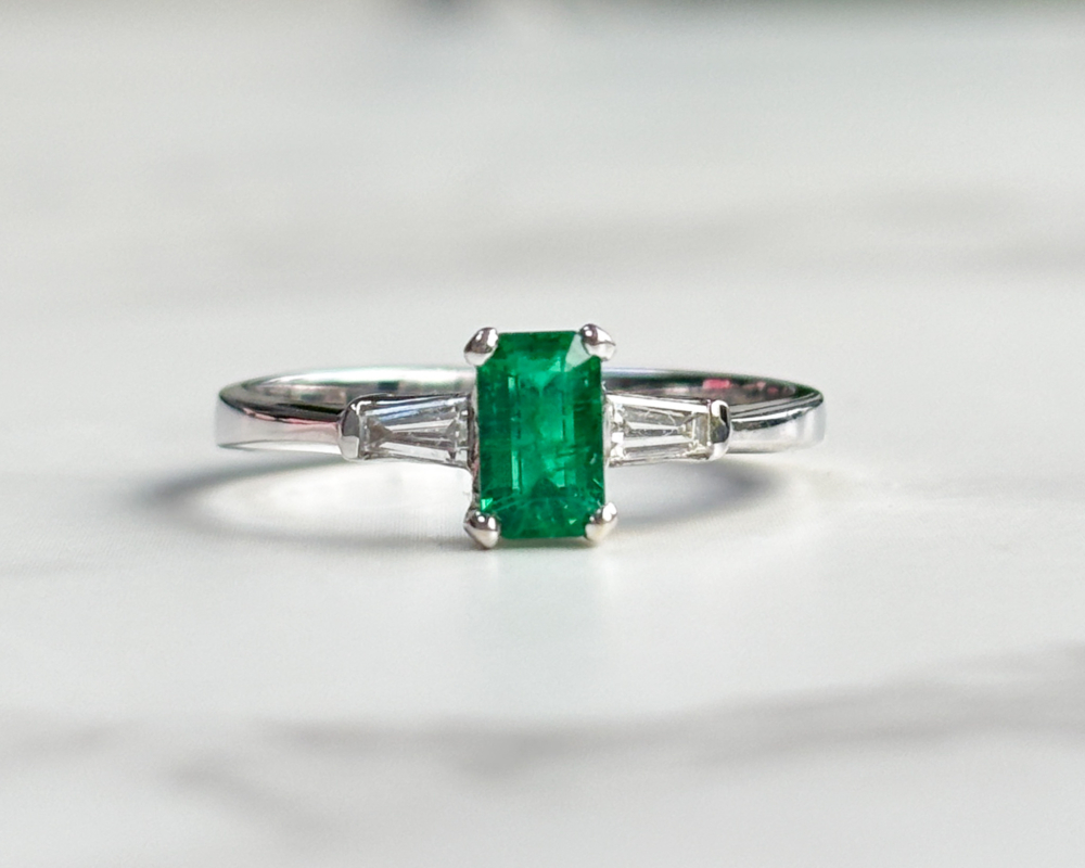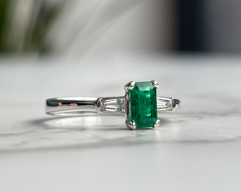 A stylish and vibrant Art Deco style emerald and diamond ring set in 18ct white gold. This contemporary emerald ring features an emerald cut emerald at its centre, flanked by a bright baguette diamond on either side. The emerald is claw set in a classic four claw design and is a vivid green which pops against the diamonds and exudes typical Art Deco glamour and sophistication. This emerald ring could be worn as an alternative engagement ring to diamonds or as an everyday dress ring.