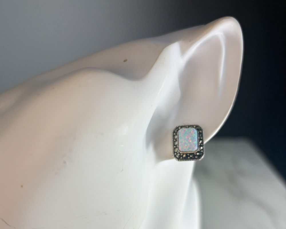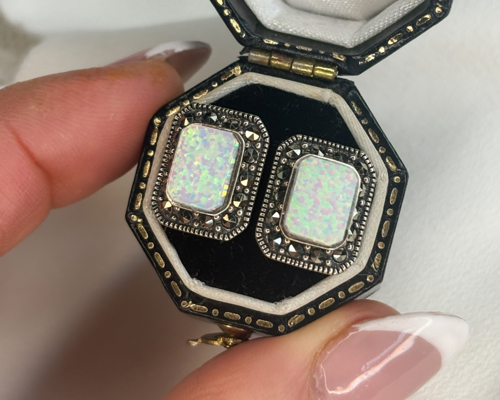 A striking pair of Art Deco style silver, opal and marcasite stud earrings for pierced ears. Each stud earring features a rectangular cut opal surrounded by small marcasite stones. The fiery opal is set in contrast to the subtle sparkle of the marcasite, really making a statement against the ear. They fasten with butterflies for a comfortable fit. Complete the set with the ring, also available to buy online.