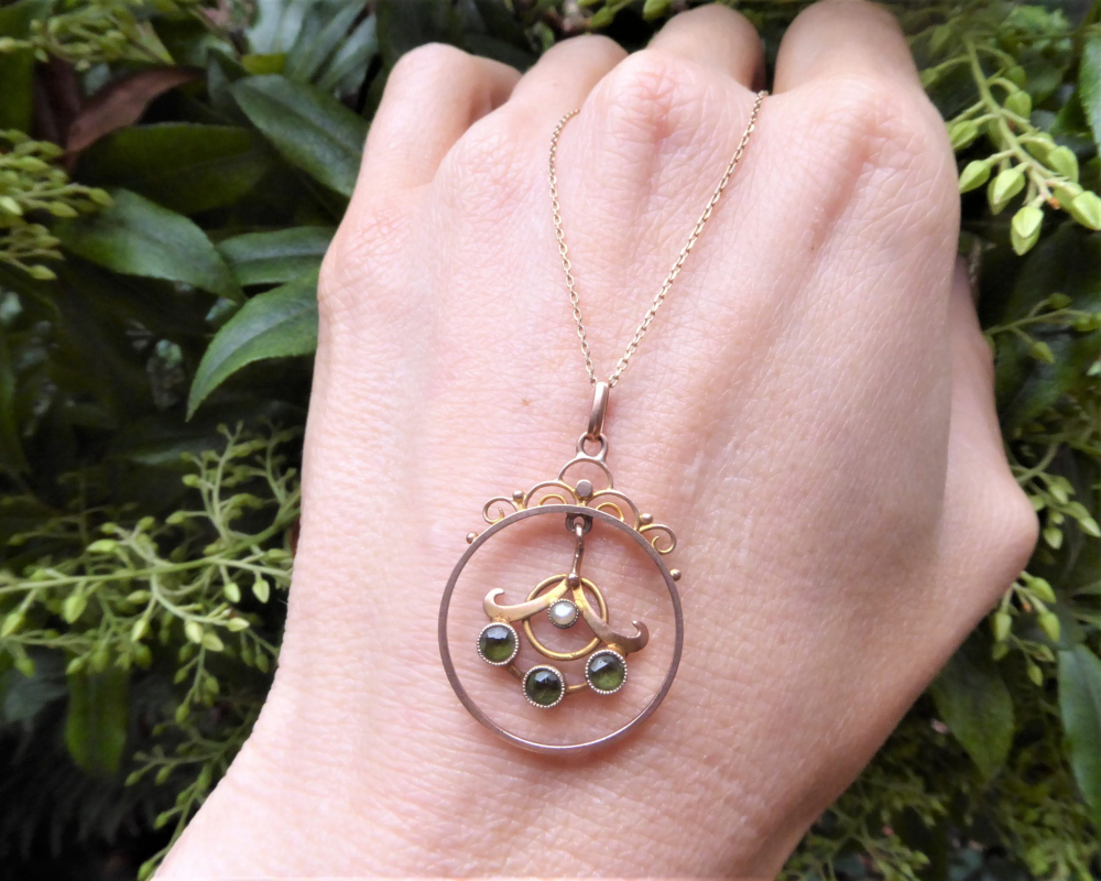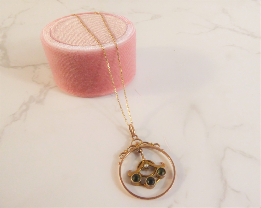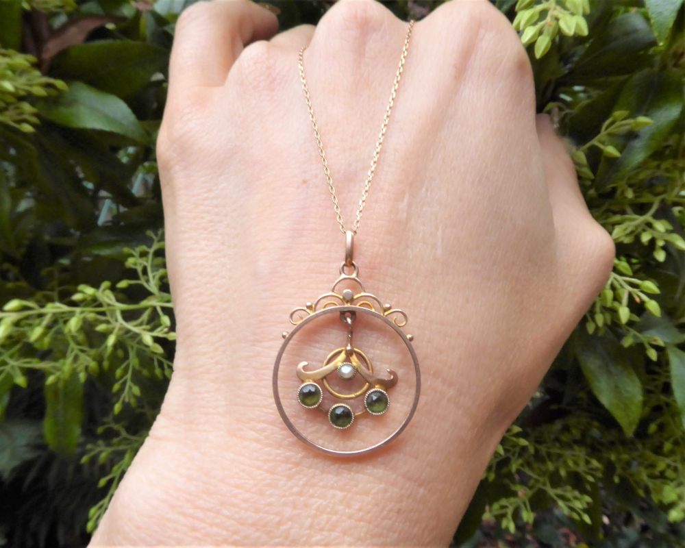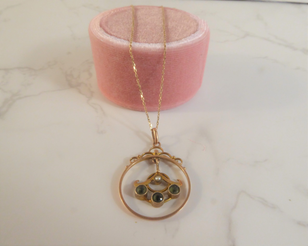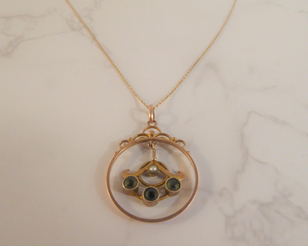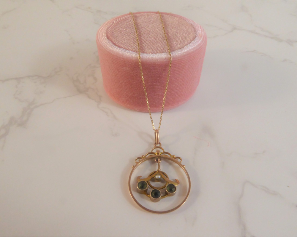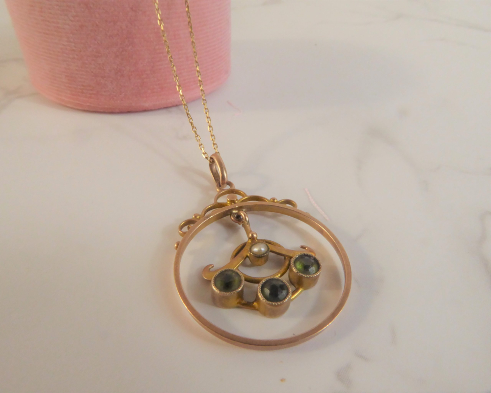 A beautiful original antique pendant crafted during the Edwardian era. The pendant is made from 9ct gold and features three peridot stones and a seed pearl. The combination of stones makes the pendant so pretty and eye catching.