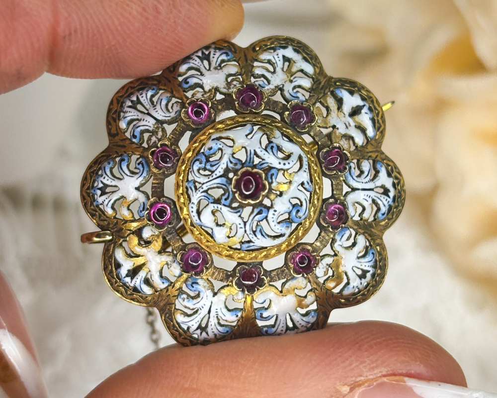 A unique and beautiful antique Victorian enamel and ruby brooch set in 18ct yellow gold. Handcrafted in France circa 1860, this ornate piece features 10 cabochon rubies set in a halo with one more in the centre. The enamel is a mix of heavenly blues and whites and has come away in parts to reveal the gold underneath. This is not detrimental to the overall look of the brooch and is reflected in the price. The brooch fastens with a pin and gold safety chain for extra security.