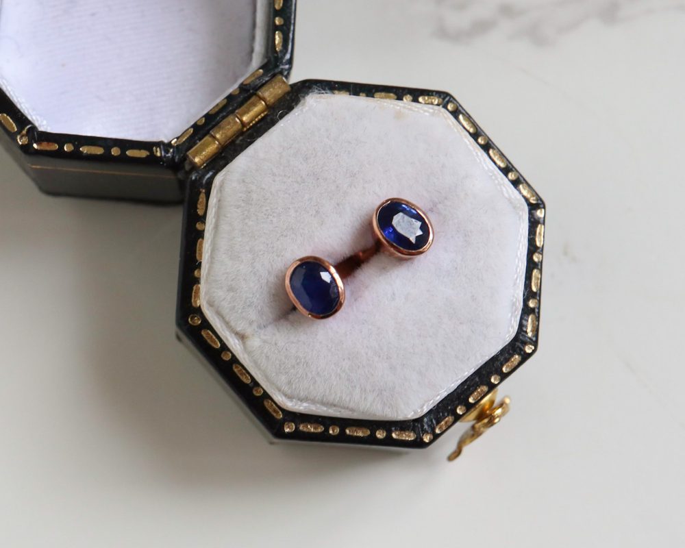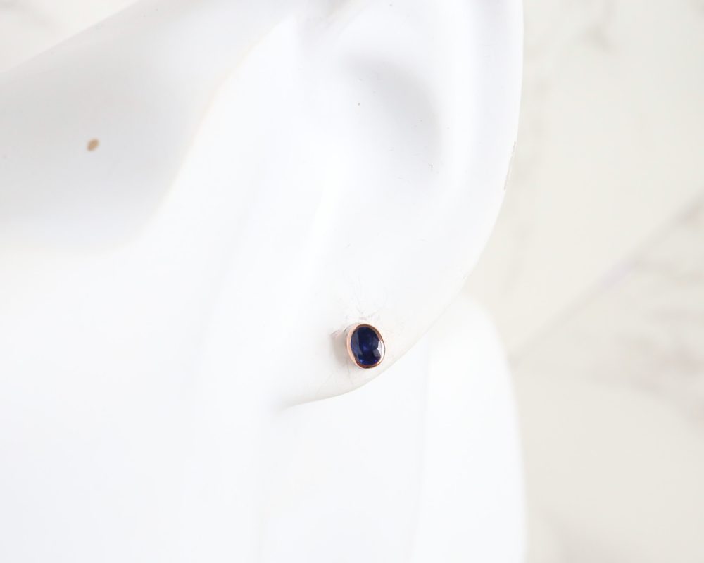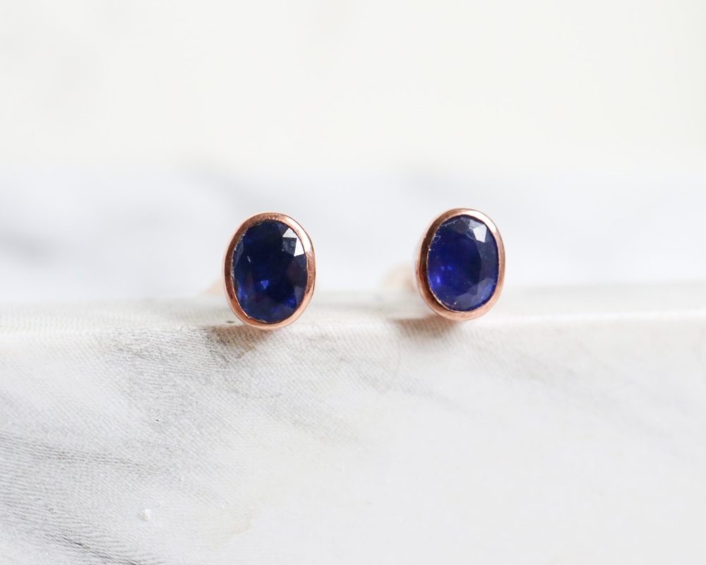 • A contemporary pair of 9ct rose gold and sapphire stud earrings. The bezel set sapphire earrings are for pierced ears and fasten to the ear with a butterfly fastening. They are simply set and classic, suitable for wearing everyday and have a matching ring and pendant also available to purchase.