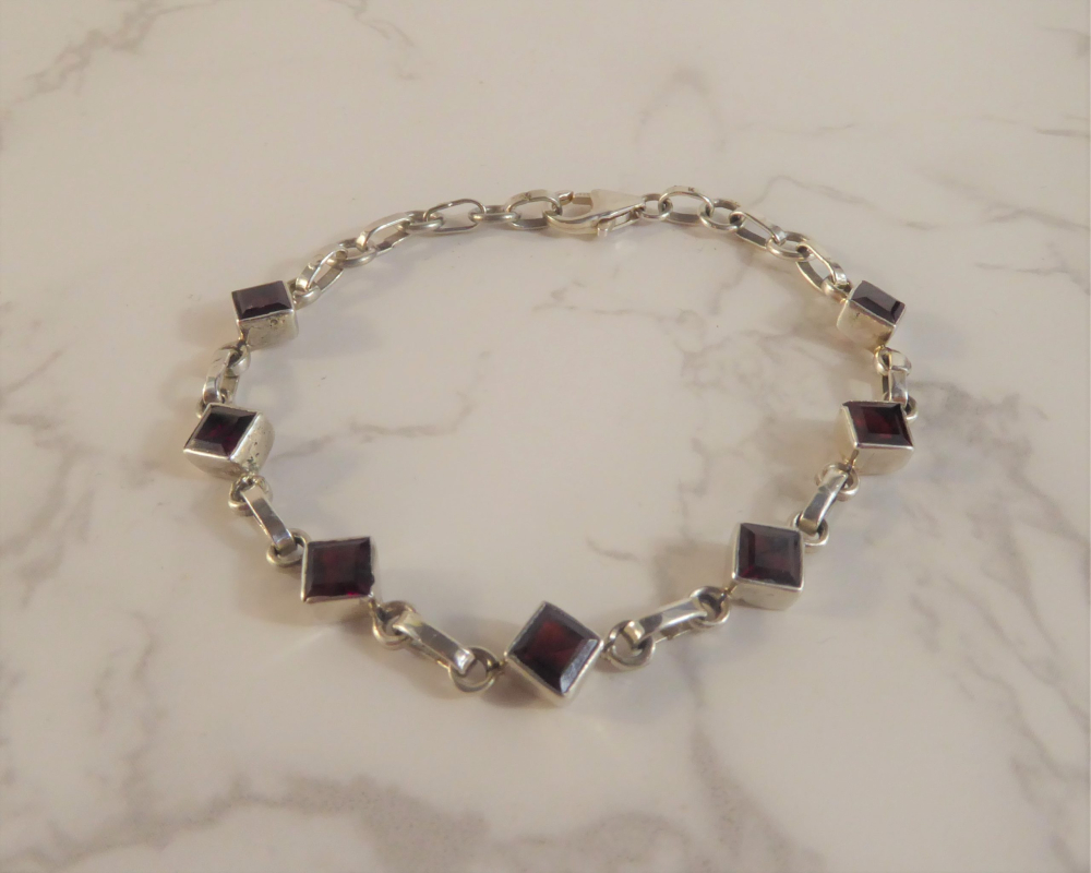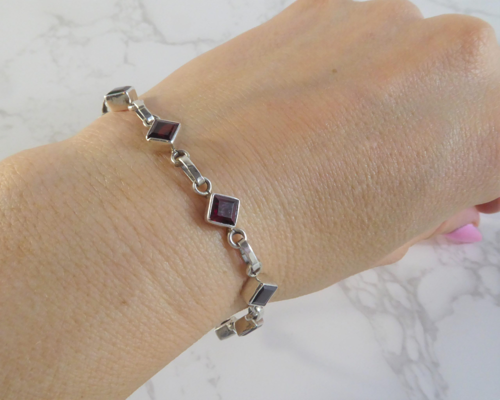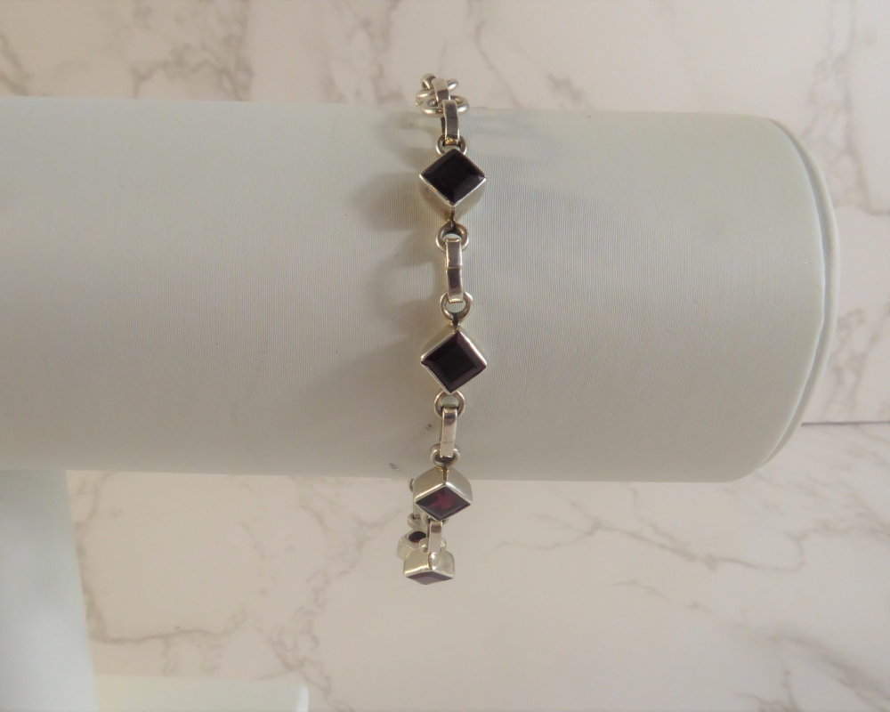 A modern silver bracelet with diamond shaped garnet links. These links are interspersed with silver chain links. It fastens with a lobster clasp which can be put onto various links to alter the length.