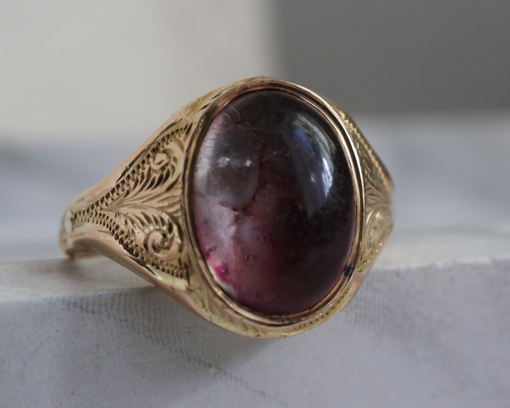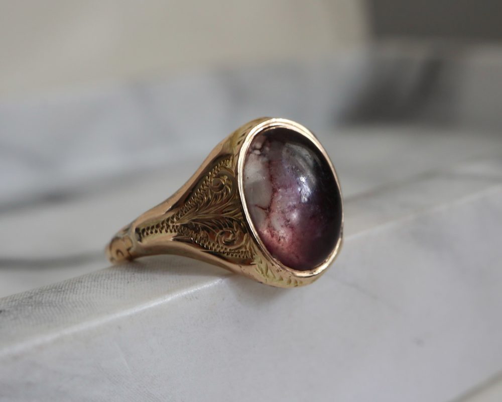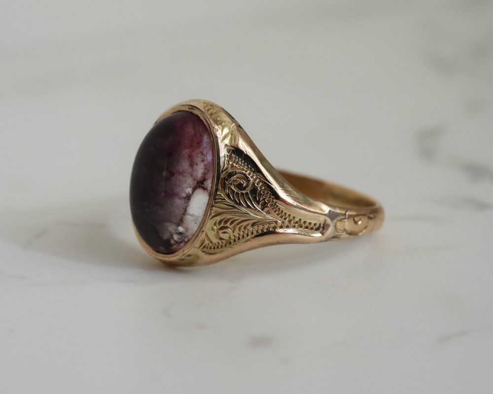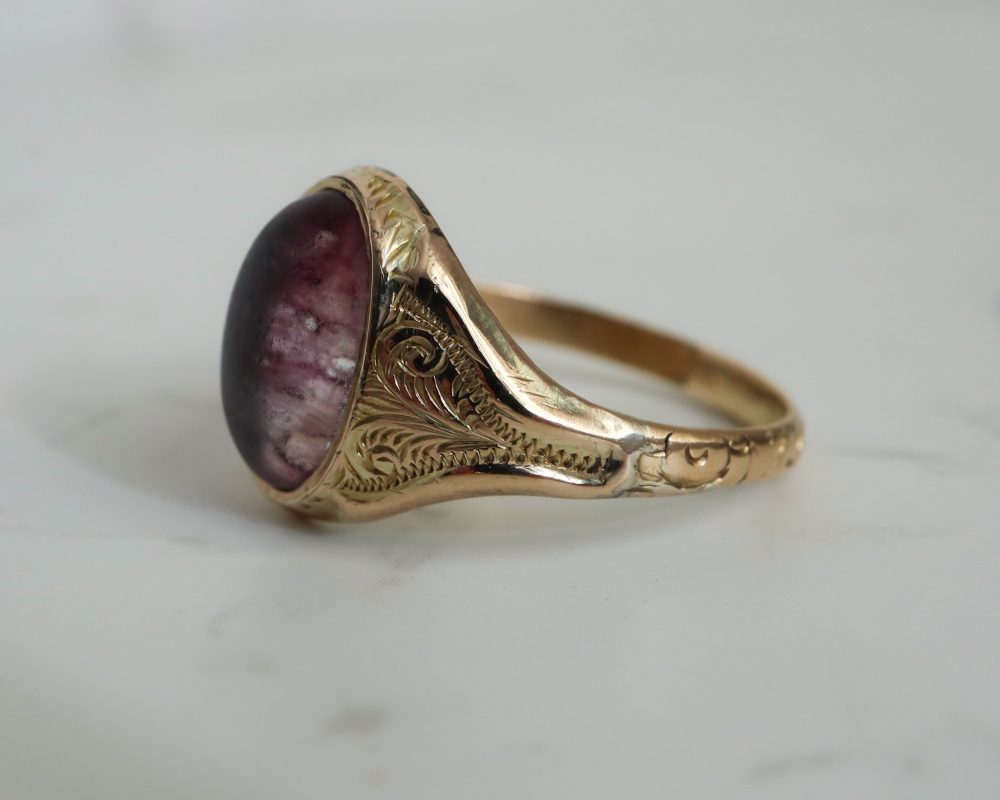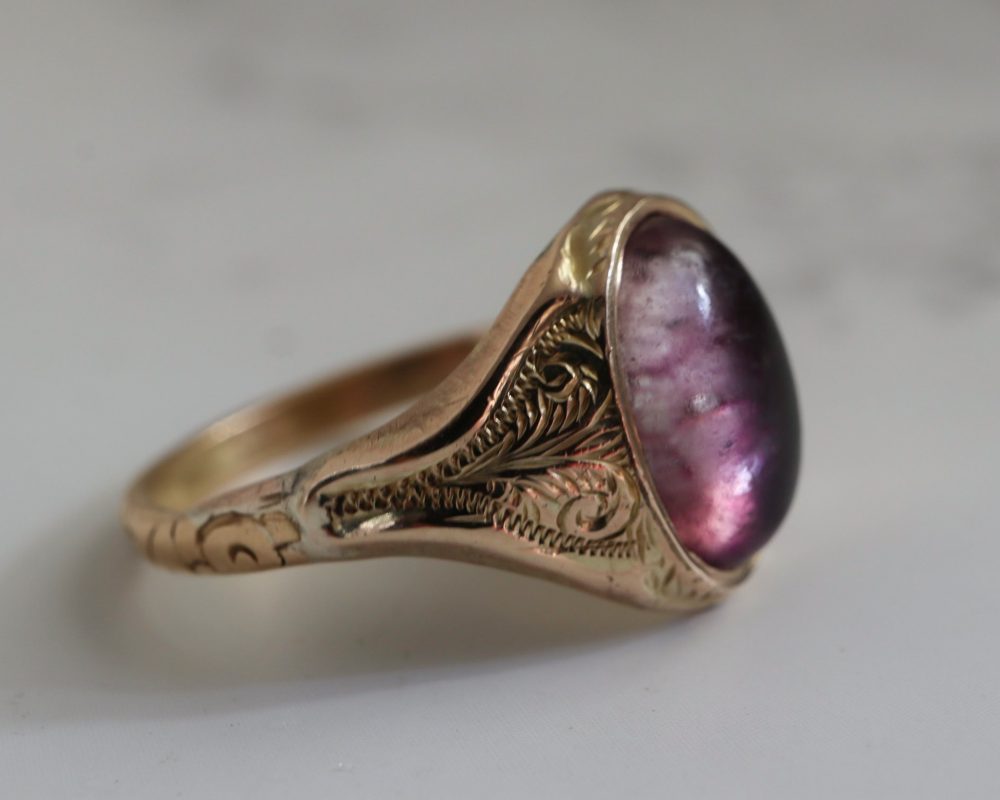 An unusual and beautiful antique Victorian ring, crafted from 9ct yellow gold in Birmingham, 1869. This antique ring features an oval cabochon stone, which we are yet to identify. It has a similar colour to amethyst, but with a mottled, or marbled effect unseen before in amethyst jewellery. Whatever the stone may be, it has a sensational depth and colour and the setting is wonderfully ornate. The engraved pattern follows the shank all the way round which gives the ring an almost medieval feel to it. It has a crisp hallmark at the back of the stone which is how we have dated the ring. All in all, this is a unique gold ring with a great age to it and mysterious allure sure to spark conversation.