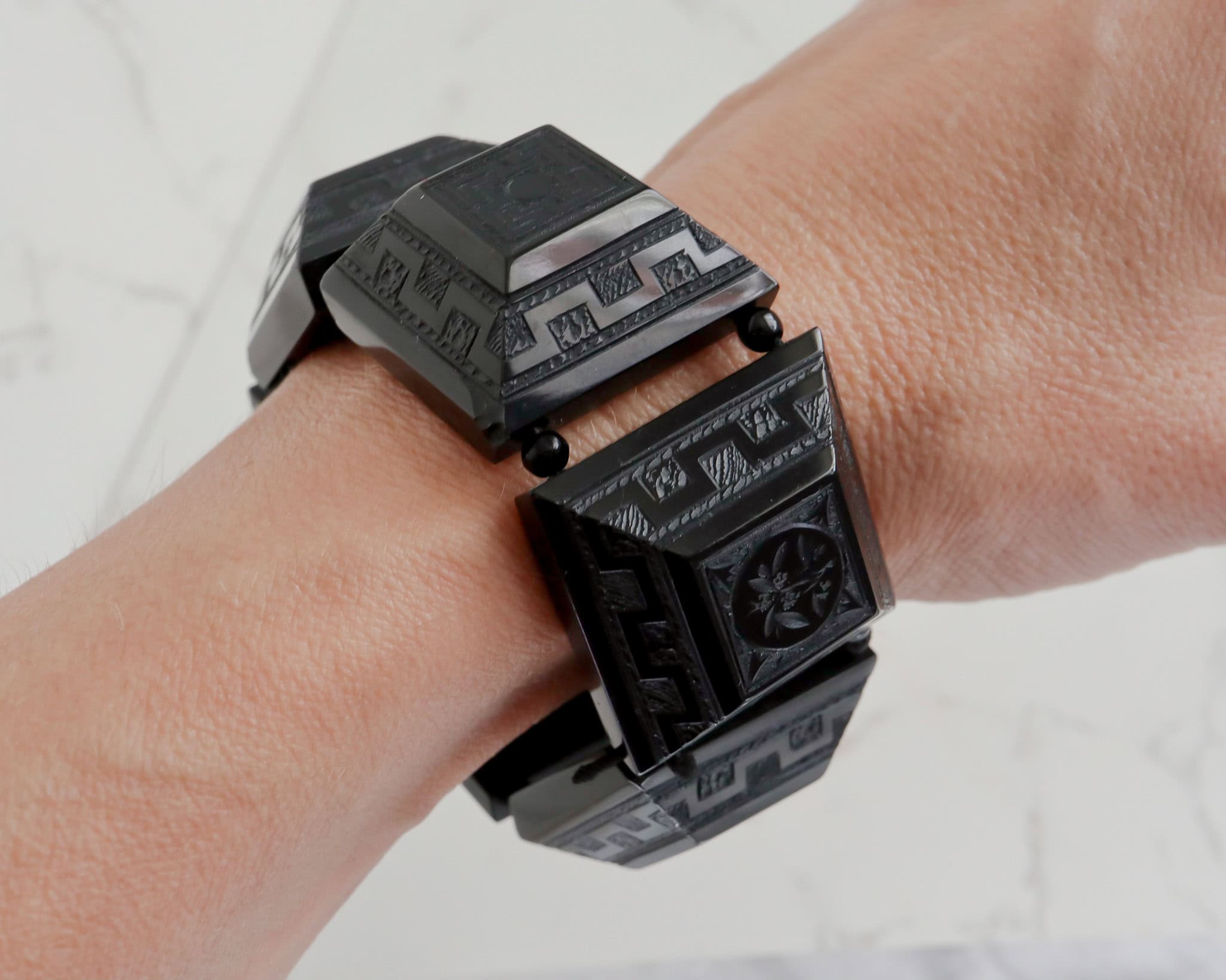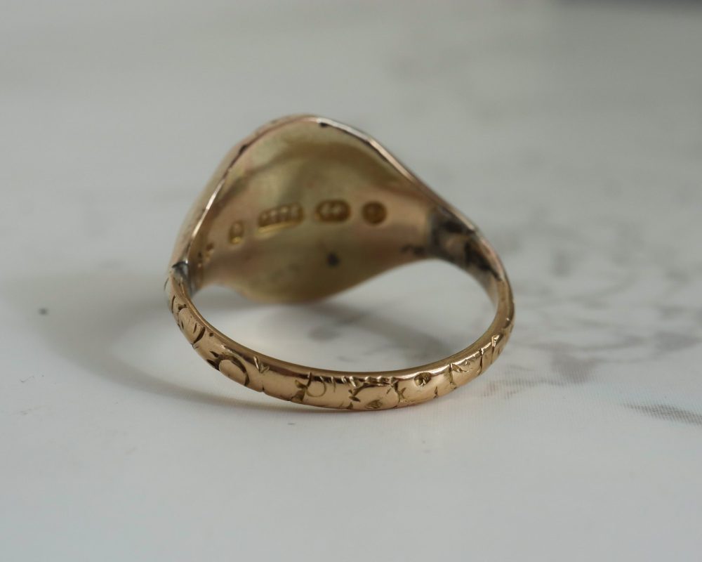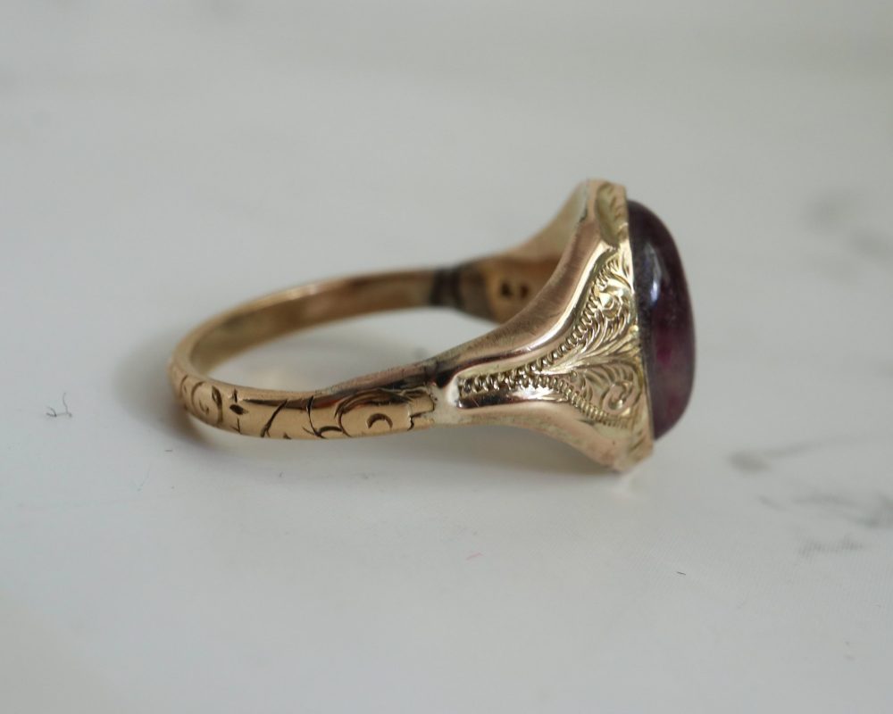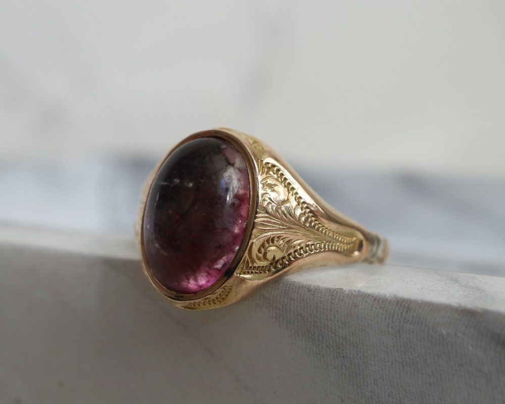 An unusual and beautiful antique Victorian ring, crafted from 9ct yellow gold in Birmingham, 1869. This antique ring features an oval cabochon stone, which we are yet to identify. It has a similar colour to amethyst, but with a mottled, or marbled effect unseen before in amethyst jewellery. Whatever the stone may be, it has a sensational depth and colour and the setting is wonderfully ornate. The engraved pattern follows the shank all the way round which gives the ring an almost medieval feel to it. It has a crisp hallmark at the back of the stone which is how we have dated the ring. All in all, this is a unique gold ring with a great age to it and mysterious allure sure to spark conversation.
