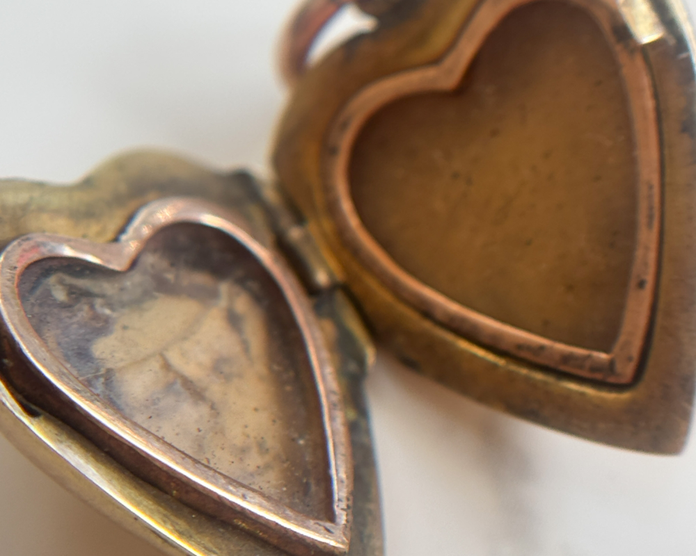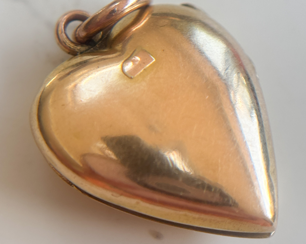Inside, the puffy heart locket opens to reveal original heart shaped photo frames, one still containing a faded old portrait, a whisper from the past that speaks to its long and meaningful journey.