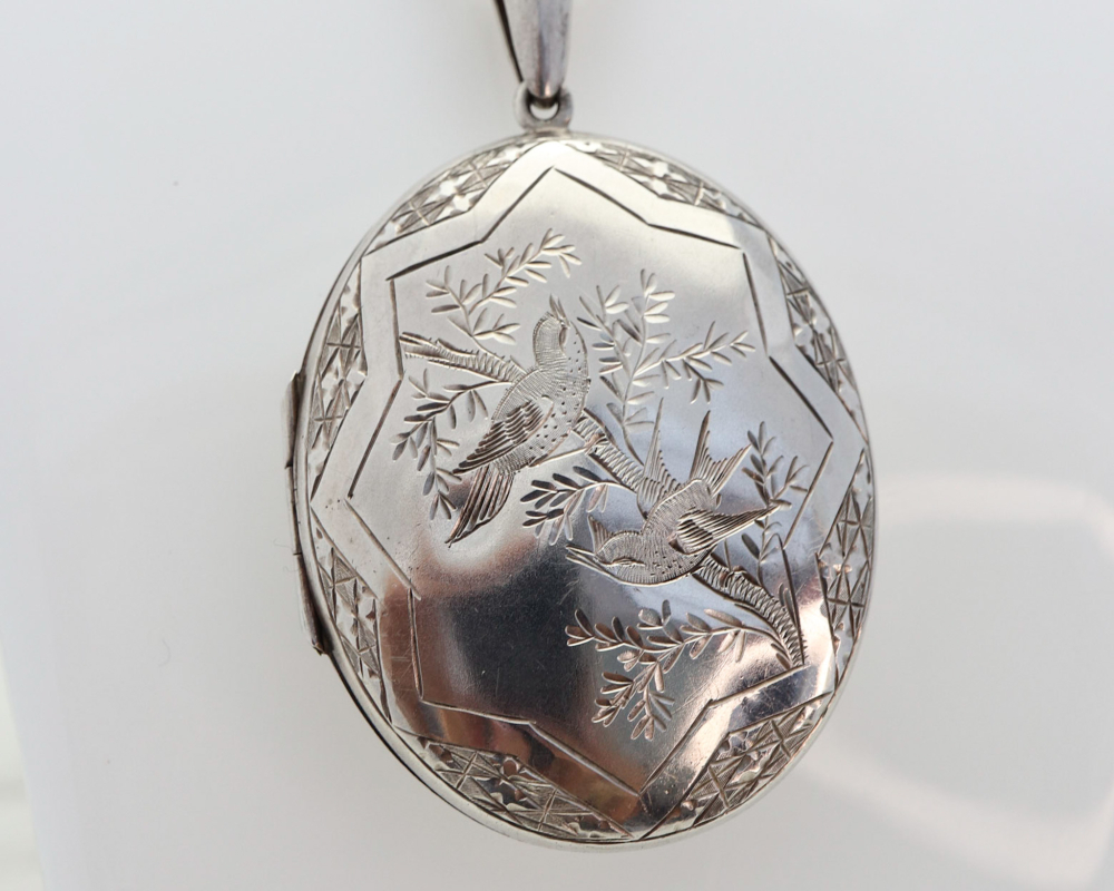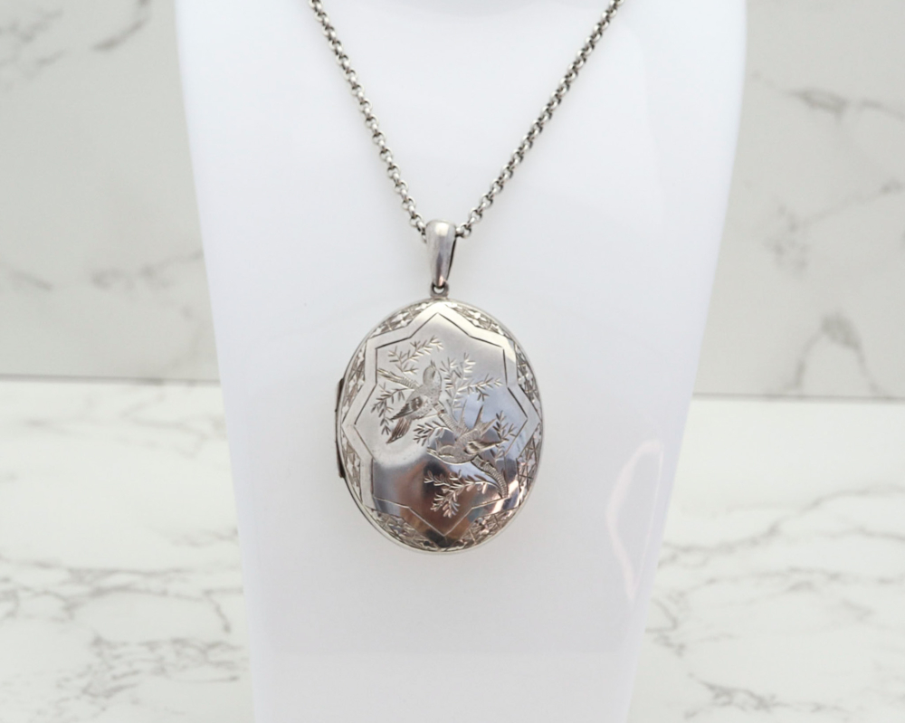 An antique large silver locket from the Victorian era 1881. On the front of the locket is beautiful and intricate engraving, depicting two birds on a branch. The back of the locket is plain silver. The locket opens and can accommodate a photograph on either side, it also has the silver stamp inside as well as the back. The locket is shown here on a modern silver chain which has been oxidised so that it is in keeping with the antique locket. This piece comes beautifully packaged in a faux leather presentation box and luxury gift bag.