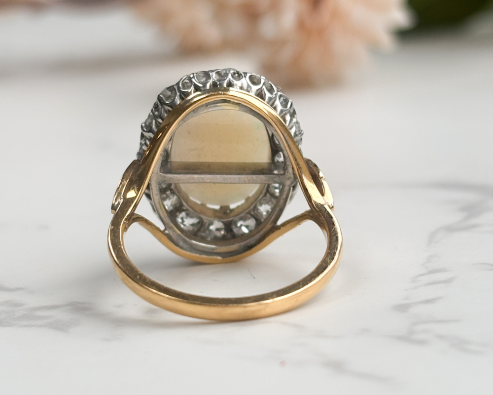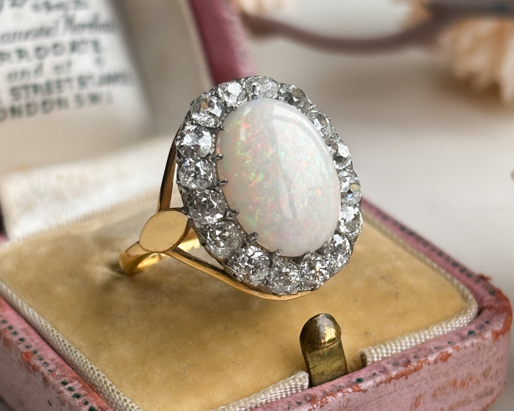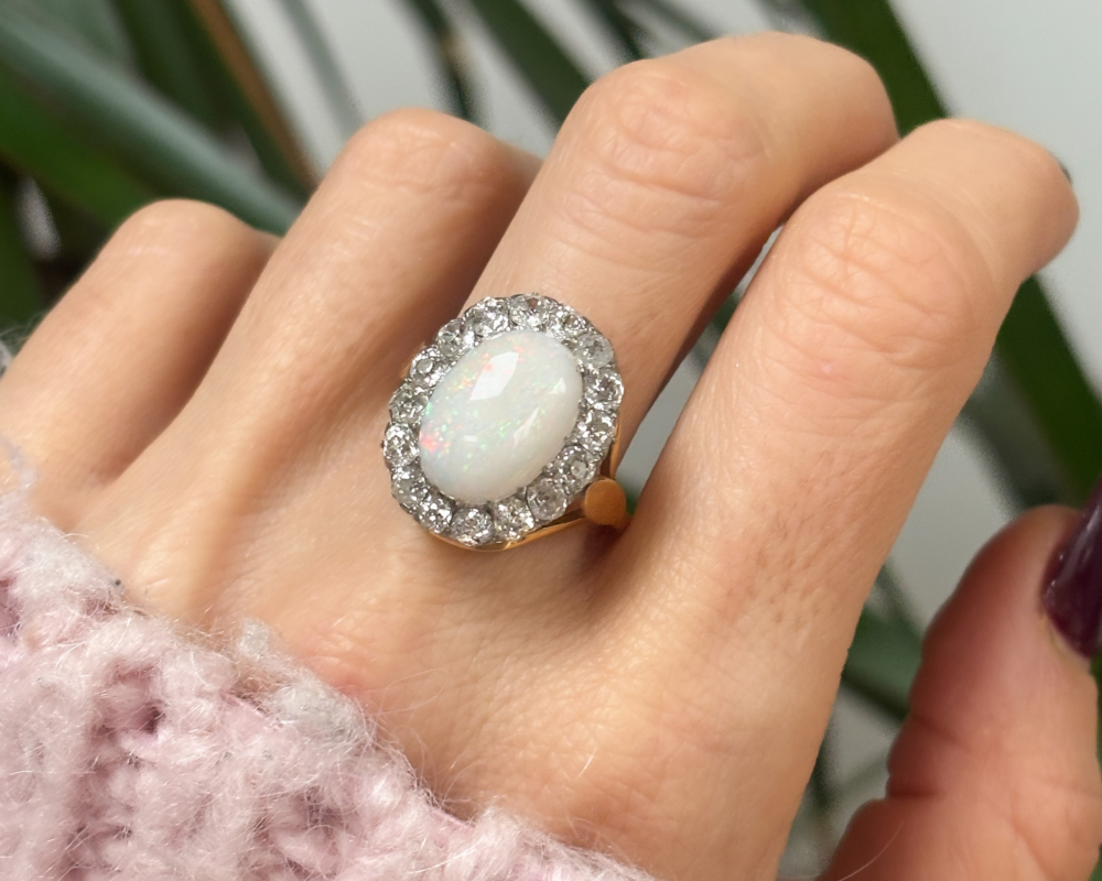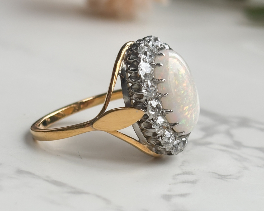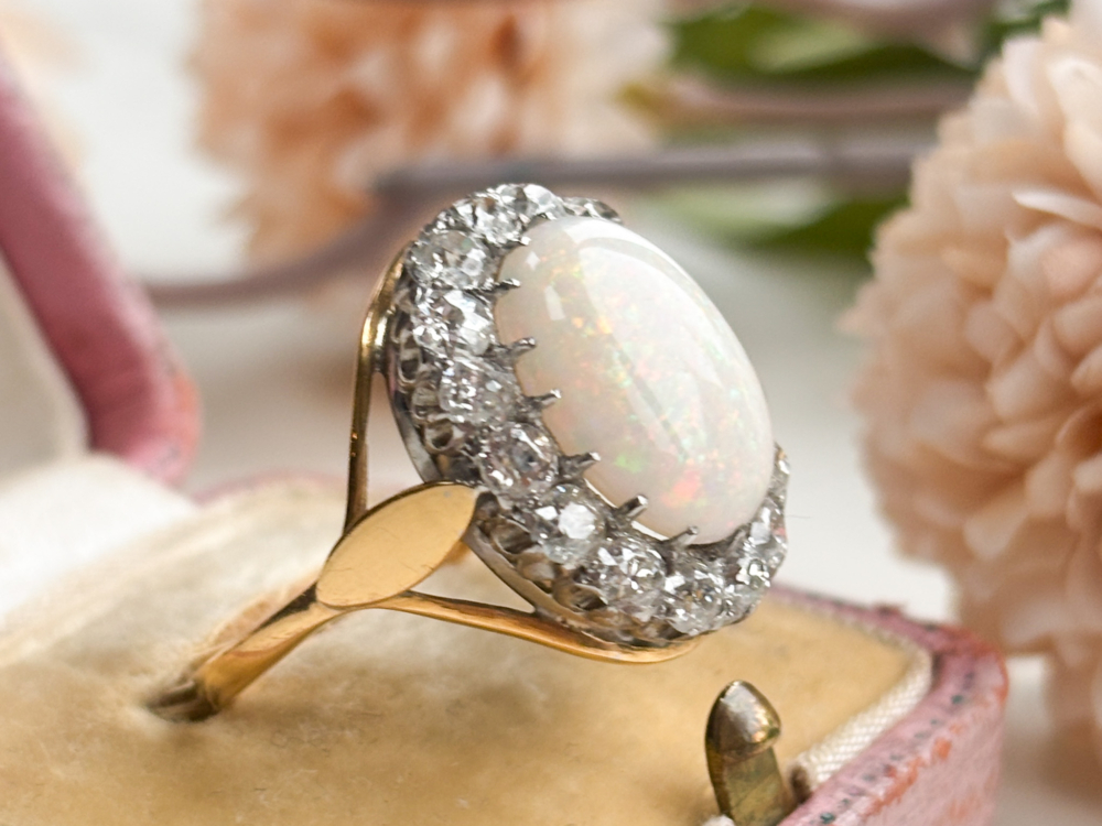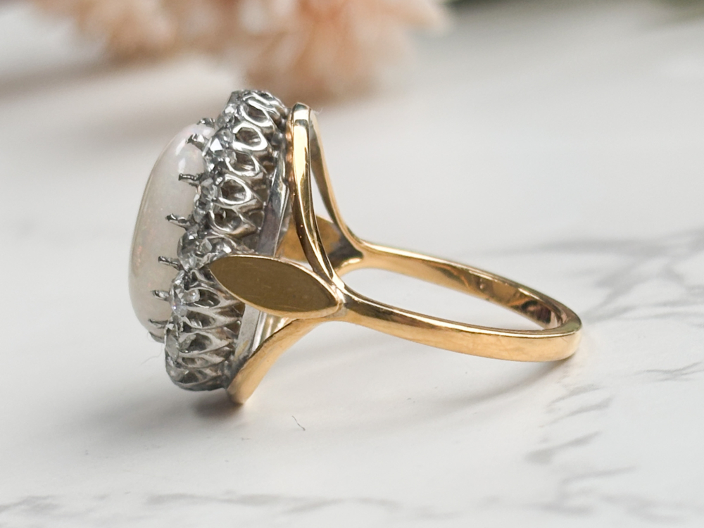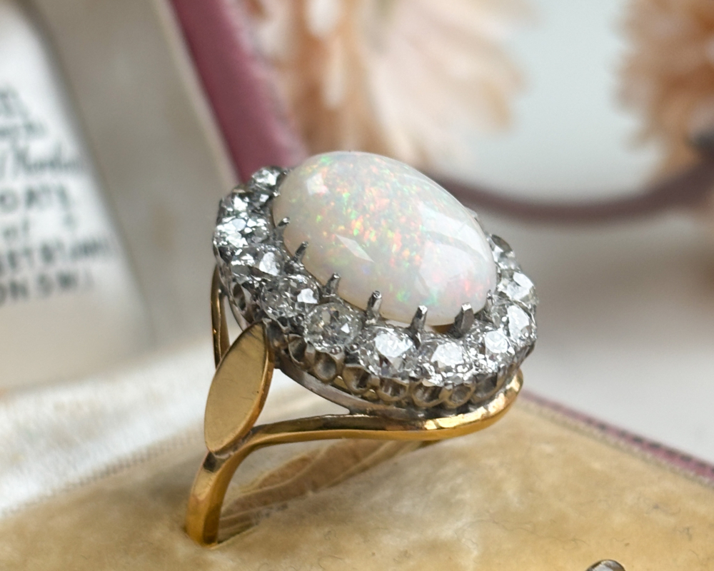 This showstopper antique ring centres on a glowing opal with soft flashes of colour, framed by a substantial halo of old cut diamonds. The diamonds are set in silver, which was traditionally used during the Victorian period to enhance their brightness under candlelight. The cluster is mounted onto an 18ct gold setting, while the later 9ct gold shank provides strength and practicality for modern wear. The broad, scalloped cluster head sits low on the finger, and the converted construction feels carefully balanced, preserving the original brooch design while allowing comfortable everyday wear.