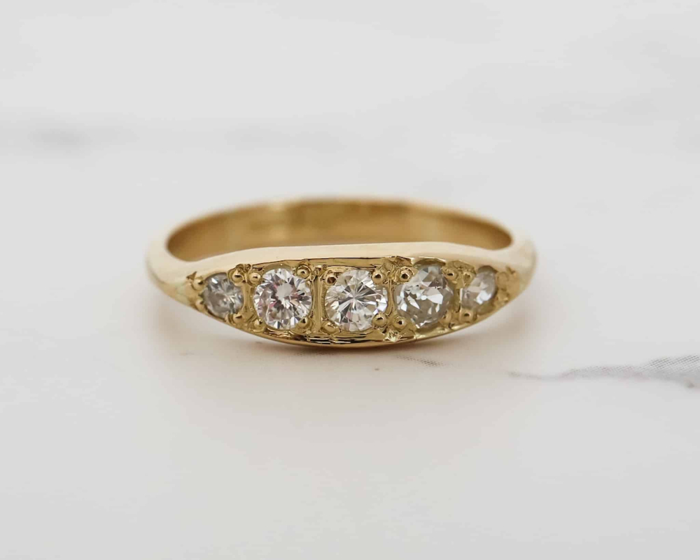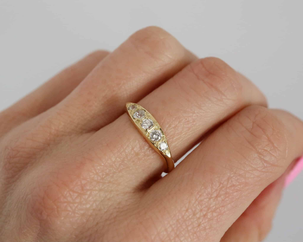 A vintage diamond boat ring set in 18ct yellow gold. The ring features five graduated diamonds set flush in the ring in a gypsy setting. It is Edwardian style but made more recently. The accurate date cannot be ascertained due to the faded hallmark. This ring could be worn as a stacking ring, on its own or as an alternative wedding ring or eternity ring. The diamonds are very bright and the ring is very good quality.