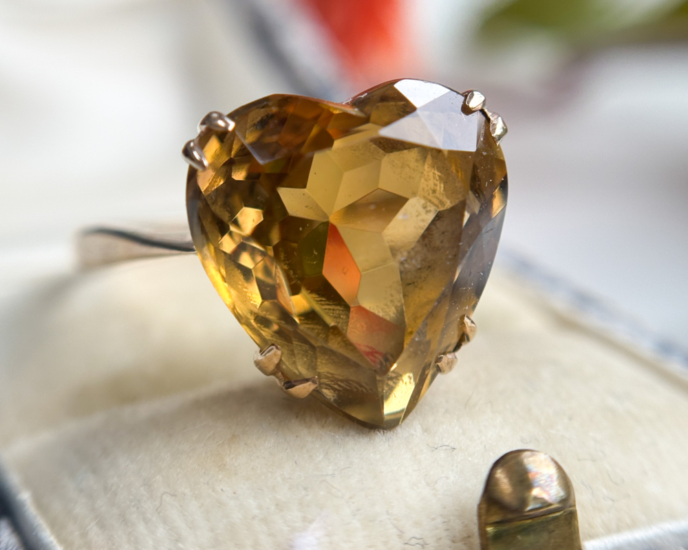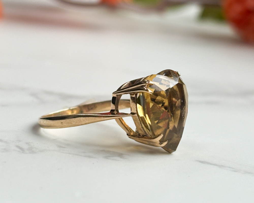 This statement ring likely dates to the 1960s or 70s, when cocktail rings made their triumphant return to fashion, and nothing said glamour like a large, heart cut gemstone. The citrine’s unique golden brown tone gives it an earthy richness that pairs perfectly with the warm gold tones of the setting.