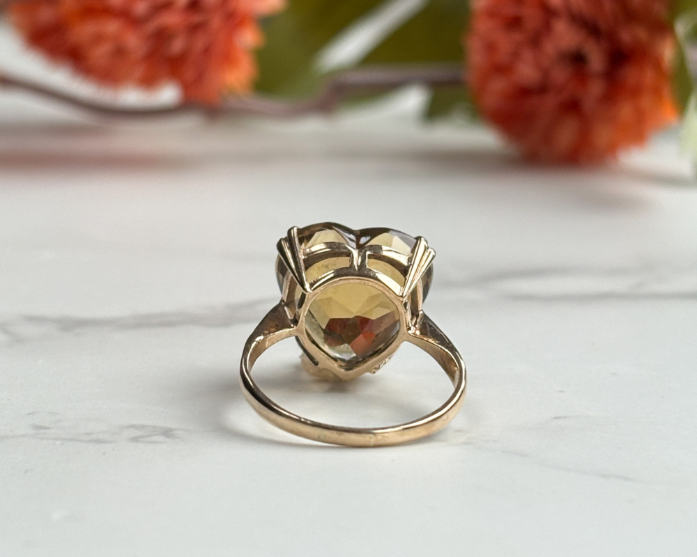 A showstopper from every angle, this bold and romantic vintage gold ring features a generous, heart shaped citrine held in a classic claw setting. The golden gem radiates warmth, its honeyed hues glowing with every flicker of light. Set in 9ct yellow gold, the design frames the citrine beautifully, allowing maximum light to dance through its many facets.