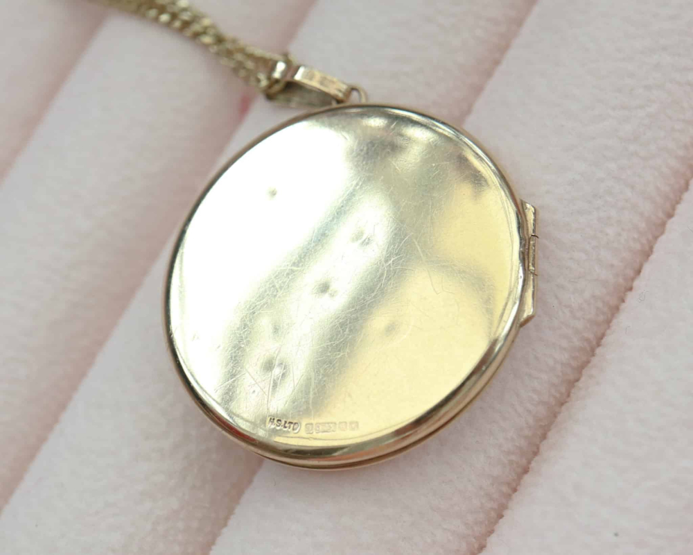 - ERA/HALLMARK: Locket is vintage, stamped Birmingham 1971, chain is stamped 9kt.