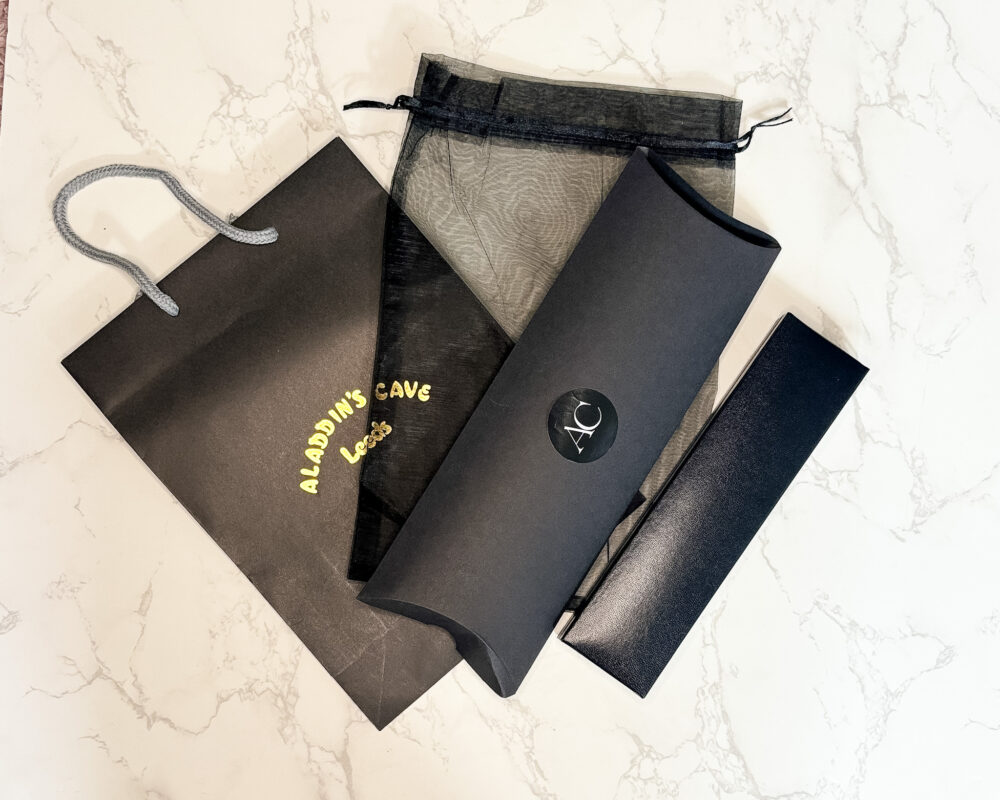 Our jewellery comes packaged in a beautiful black faux leather box and black branded gift bag.