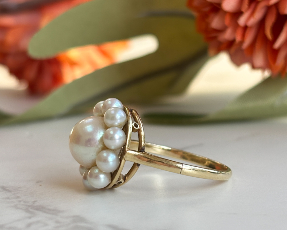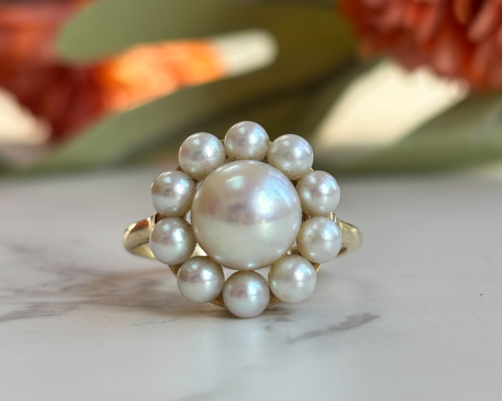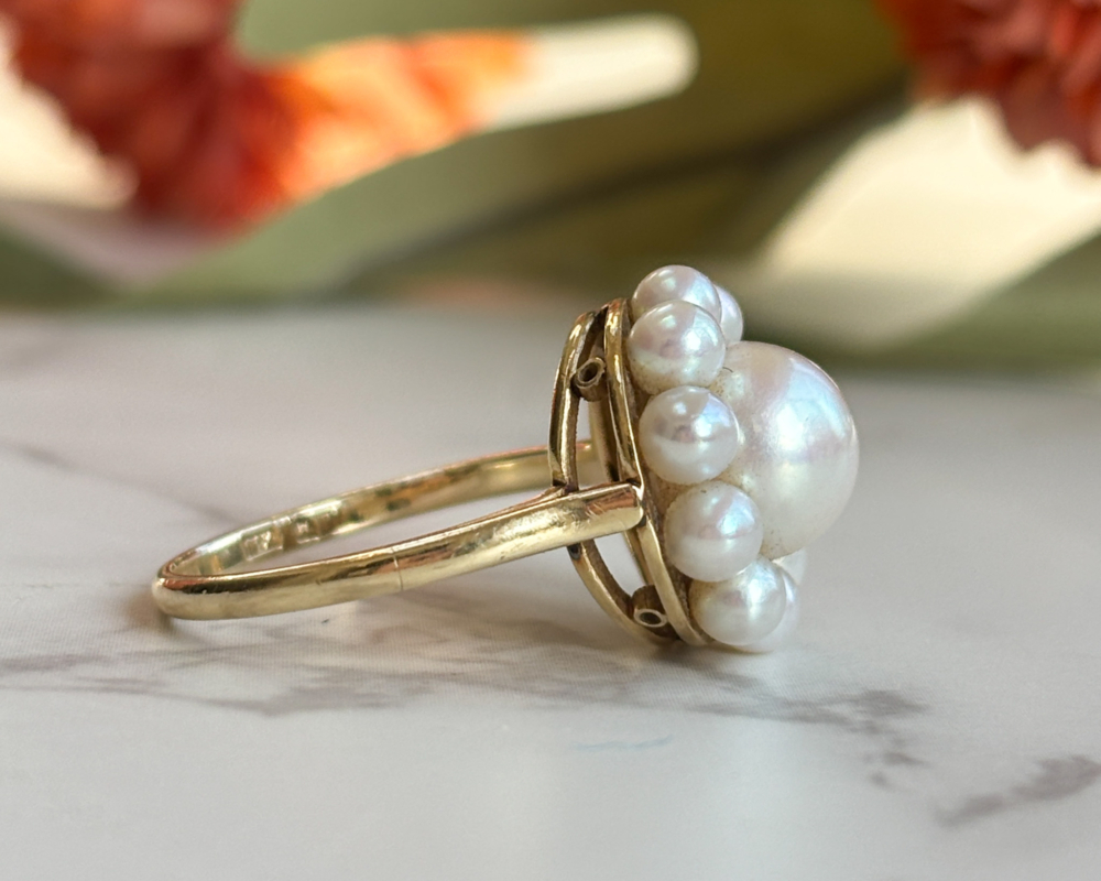 This is a highly collectible vintage Mikimoto pearl ring circa 1960s. Made from 14ct yellow gold, the ring features a cluster of high lustre cultured pearls, arranged in a flower setting. As the pioneers of cultured pearls since 1893, Mikimoto has long been synonymous with quality, elegance and precision. The design is both refined and wearable, with lovely gold details on the underside of the ring that complements the pearl’s natural beauty.