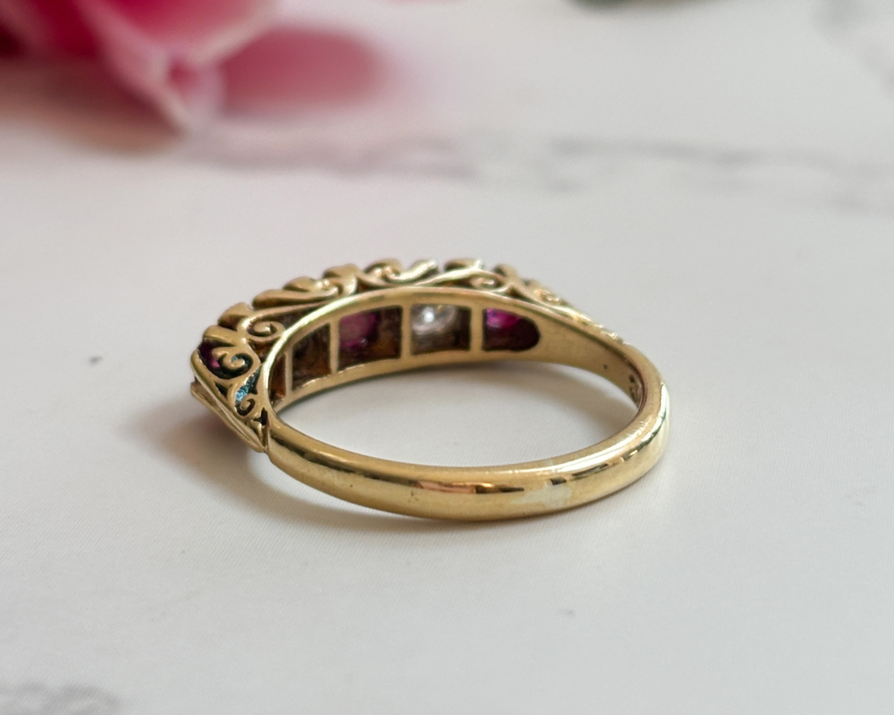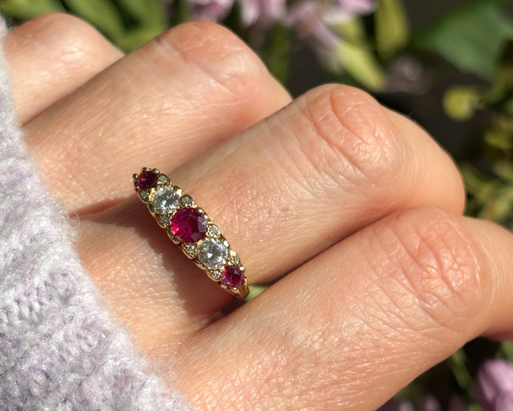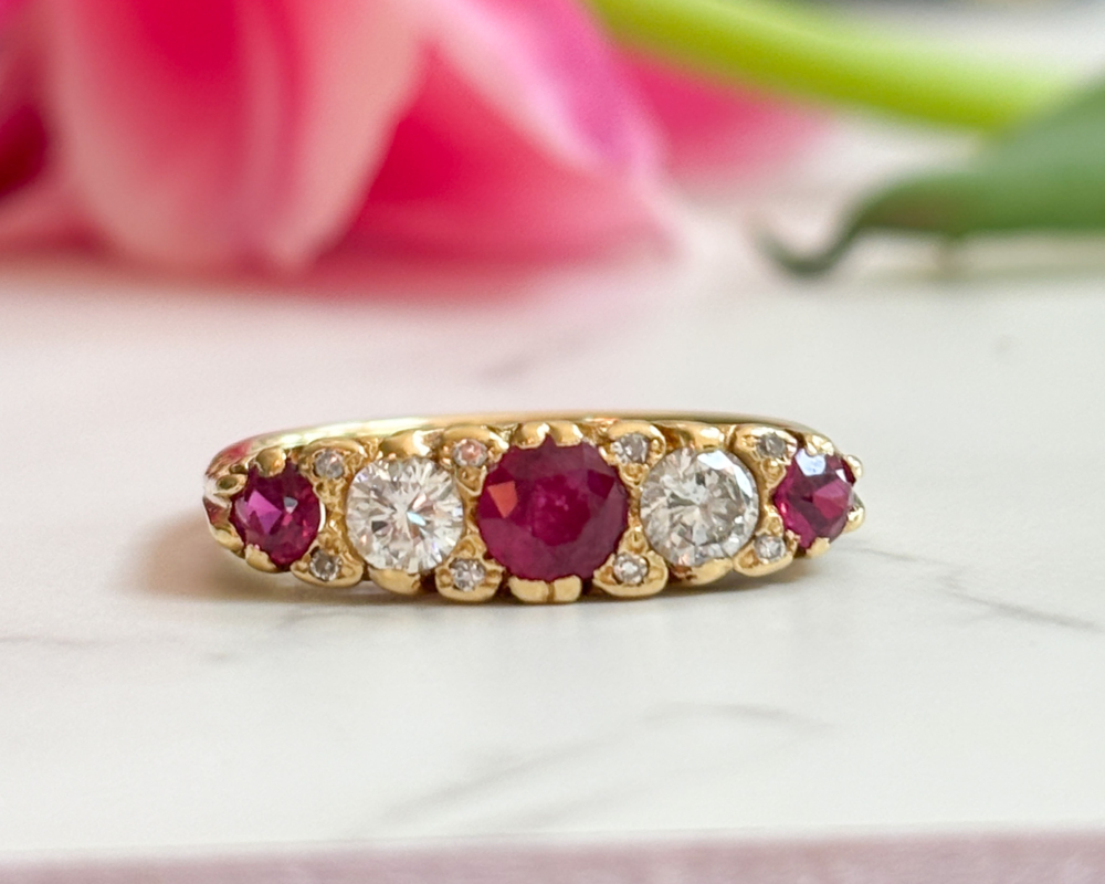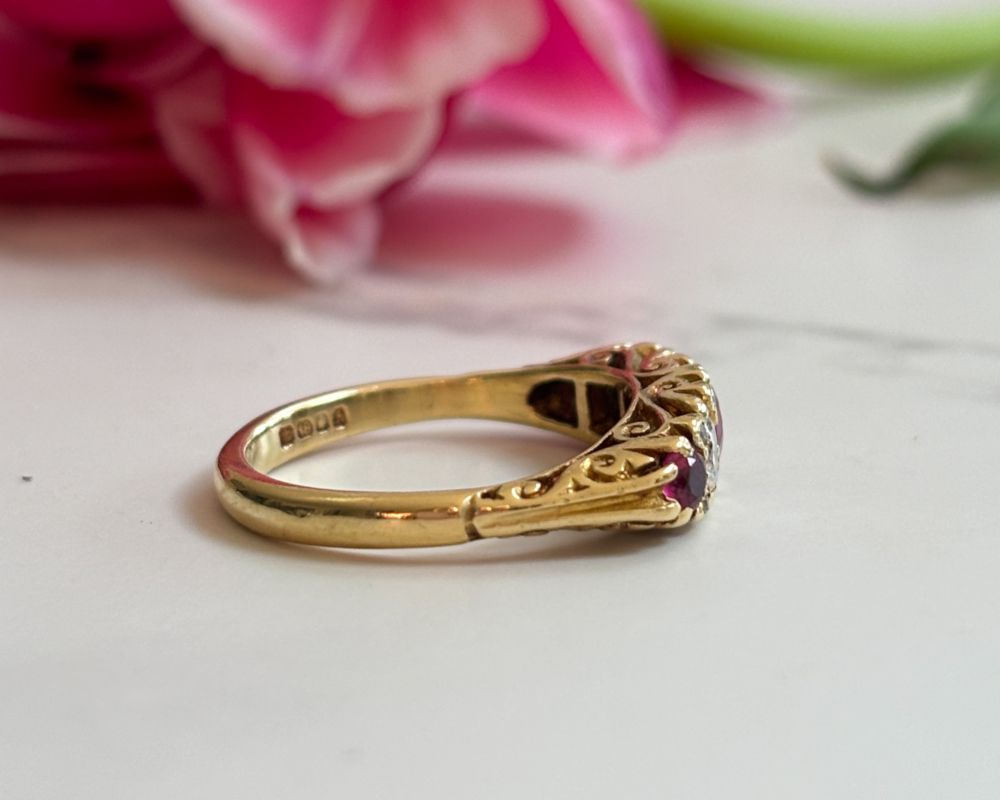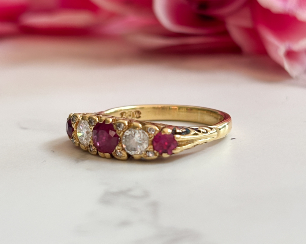 Rich in colour and full of character, this vintage ruby and diamond gypsy ring has hallmarks for 1963, with a nod to the Victorian and Edwardian versions that preceded it . Set in solid 18ct yellow gold, the ring features a vibrant central ruby flanked by sparkling brilliant cut diamonds and smaller rubies. The stones are arranged in a classic five stone layout, with the vibrant red rubies and bright white diamonds perfectly complemented by the warm gold setting. The softly curved band sits low and comfortably on the hand, true to the practical elegance of traditional gypsy rings.